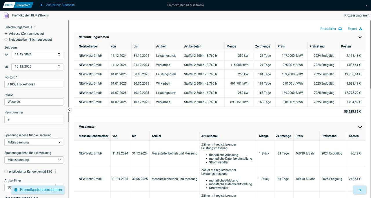 Auf Basis der übermittelten Verbrauchsdaten werden für ein Netz, bzw. eine konkrete Marktlokation, und den angegebenen Lieferzeitraum die Netz- und Messstellenkosten sowie sonstige Kosten (Umlagen und Abgaben) kalkuliert. Für die Kalkulation einer konkreten Lieferstelle (Lokationsadresse) werden alle im Lieferzeitraum gültigen Preisregelungen ermittelt sowie die anfallenden Kosten mit jahresscharfer Abgrenzung errechnet und ausgegeben. Im Fall der Kalkulation für einen vorgegebenen Netzbetreiber wird die zum angegebenen Stichtag gültige Preisregelung herangezogen und für einen Zeitraum von einem Jahr die Kosten berechnet. Die Ausgabe der Kosten erfolgt dabei für jeden Artikel separat. Die Kostenermittlung für den Messstellenbetrieb erfolgt unter Berücksichtigung des vom Messstellenbetreiber beschriebenen Standardmessumfangs in Abhängigkeit von der eingegebenen Messspannung.