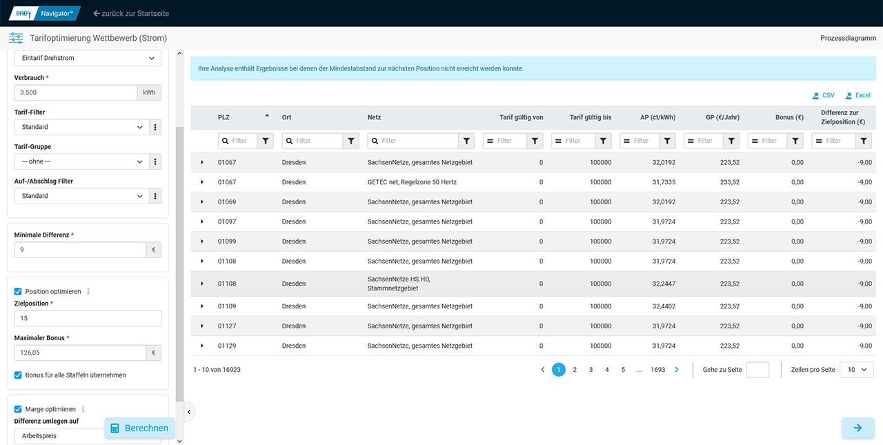 Nach der Definition aller Parameter kann die Optimierung gestartet werden. Dazu werden alle Orte analysiert, in denen der Tarif verfügbar ist, und die jeweils optimale Höhe des Bonus bestimmt, die zur Erreichung der Zielposition erforderlich ist.