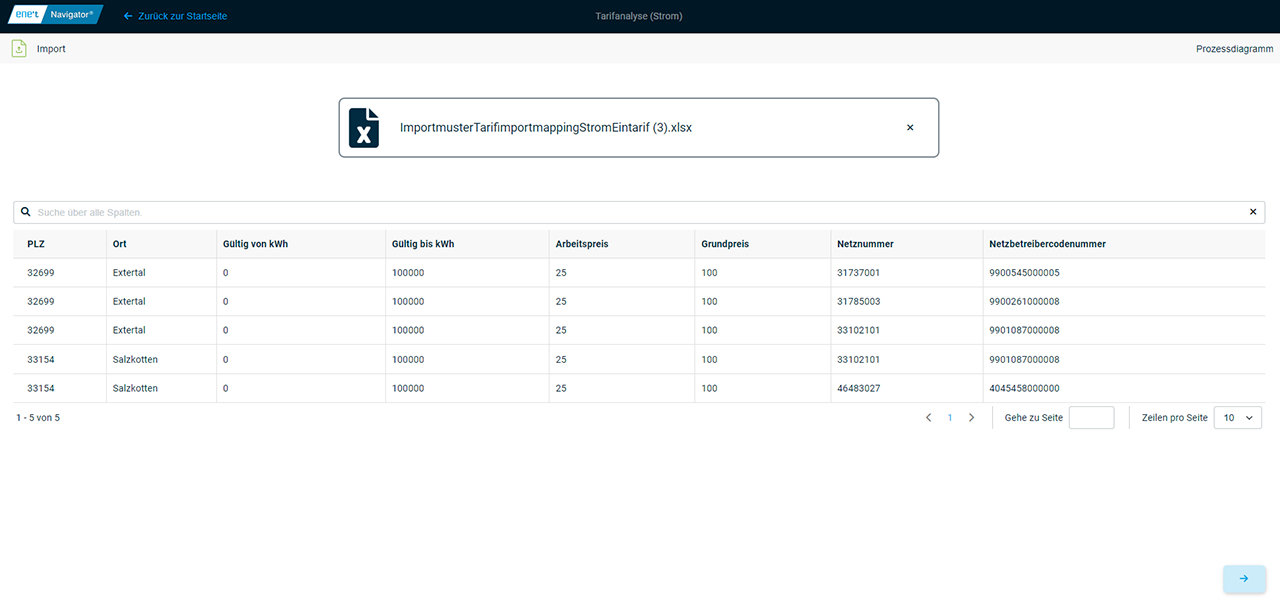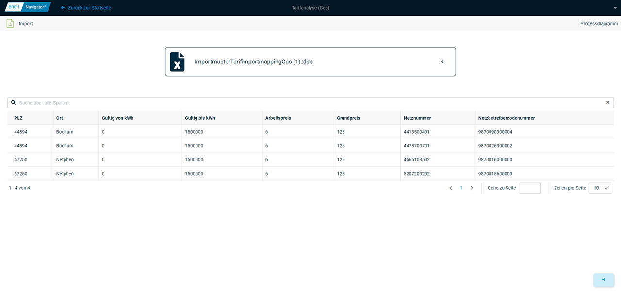 In den Prozessen Tarifanalyse (Gas) und Tarifanalyse (Strom) kann als optionaler Zuordnungsparameter und alternativ zur ene't Netznummer die offizielle Netzbetreibercodenummer übergeben werden. So wird eine eindeutige Zuordnung der auf Postleitzahl-Ort-Ebene importierten Tarifdaten zu den korrekten Netzbetreibern sichergestellt.