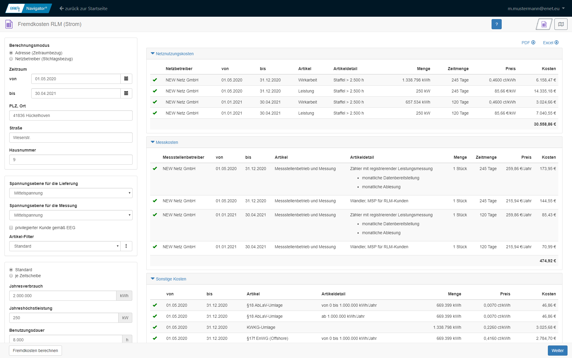 Auf Basis der übermittelten Verbrauchsdaten werden für ein Netz, bzw. eine konkrete Marktlokation, und den angegebenen Lieferzeitraum die Netz- und Messstellenkosten sowie sonstige Kosten (Umlagen und Abgaben) kalkuliert. Für die Kalkulation einer konkreten Lieferstelle (Lokationsadresse) werden alle im Lieferzeitraum gültigen Preisregelungen ermittelt sowie die anfallenden Kosten mit jahresscharfer Abgrenzung errechnet und ausgegeben. Im Fall der Kalkulation für einen vorgegebenen Netzbetreiber wird die zum angegebenen Stichtag gültige Preisregelung herangezogen und für einen Zeitraum von einem Jahr die Kosten berechnet. Die Ausgabe der Kosten erfolgt dabei für jeden Artikel separat. Die Kostenermittlung für den Messstellenbetrieb erfolgt unter Berücksichtigung des vom Messstellenbetreiber beschriebenen Standardmessumfangs in Abhängigkeit von der eingegebenen Messspannung.