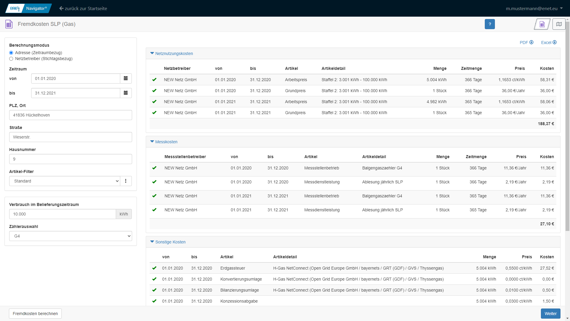 Im Fall der Kalkulation für einen vorgegebenen Netzbetreiber wird die zum angegebenen Stichtag gültige Preisregelung herangezogen. Dann werden die Kosten für einen Zeitraum von einem Jahr berechnet. Die Ausgabe der Kosten erfolgt dabei für jeden Artikel separat. Die Kostenermittlung für den Messstellenbetrieb erfolgt unter Berücksichtigung des vom Messstellenbetreiber beschriebenen Standardmessumfangs in Abhängigkeit von der eingegebenen Messspannung.