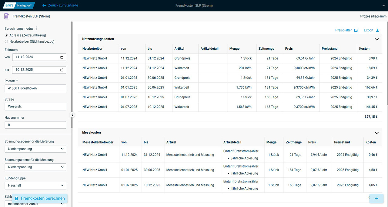 Zusätz­lich wer­den neben den berech­ne­ten Fremd­kos­ten auch die der Berech­nung zugrun­de­lie­gen­den und vom Netz­be­trei­ber ver­öf­fent­lich­ten Prei­se angezeigt.