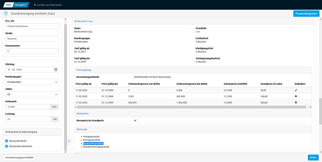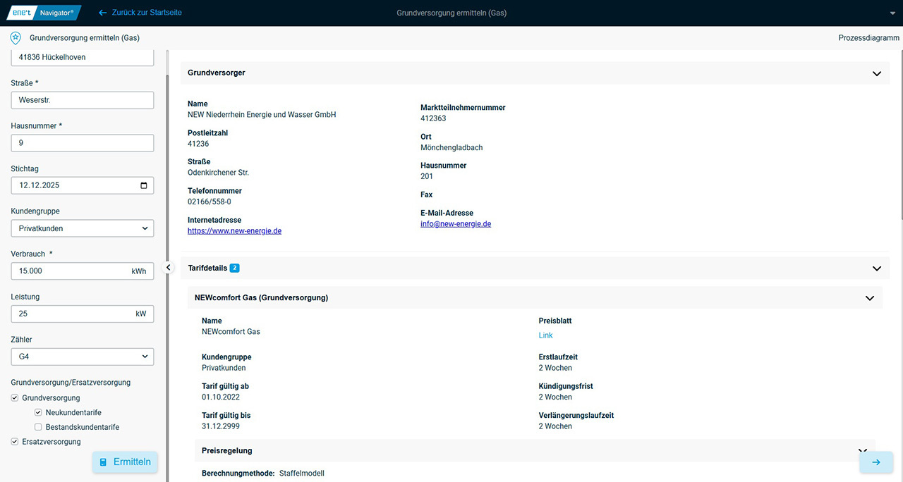 Es wird der für die Adresse der am gewählten Stichtag zuständige Grundversorger bestimmt. Für diesen wird der zur Kundengruppe passende Tarif ermittelt.