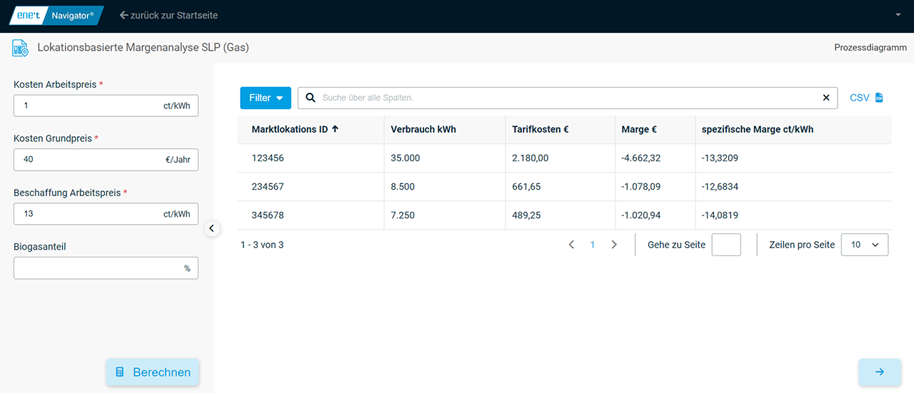 Als Teil des Prozesses Preisanpassung Bestandskunden SLP (Gas) auf dem ene't Navigator® unterstützt Sie unsere App Lokationsbasierte Margenanalyse SLP (Gas) dabei, lokations- und verbrauchsscharf und somit auch kundenbezogen Ihre Margen zu analysieren sowie als objektive Grundlage des Prozesses Preisanpassung Bestandskunden SLP (Gas) auch dabei, eine Entscheidung zu treffen, bei welchen Kunden eine Preisanpassung erforderlich ist und bei welchen Kunden darauf verzichtet werden kann.