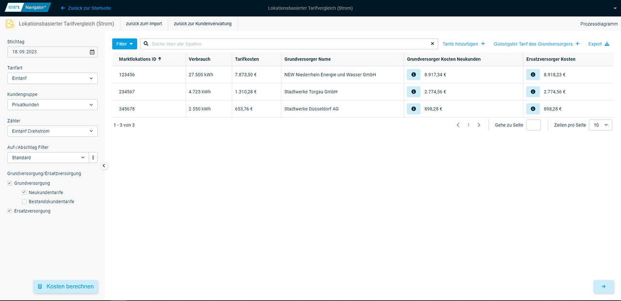 Kernfunktion der App Lokationsbasierter Tarifvergleich (Strom) ist es, eine Auswahl an Marktlokationen mit unterschiedlichen Verbräuchen in ein Verhältnis zu den Grundversorgungsprodukten sowie zu beliebigen Konkurrenzprodukten zu stellen. Hierbei können bis zu fünfzigtausend Lieferstellen gleichzeitig betrachtet werden.