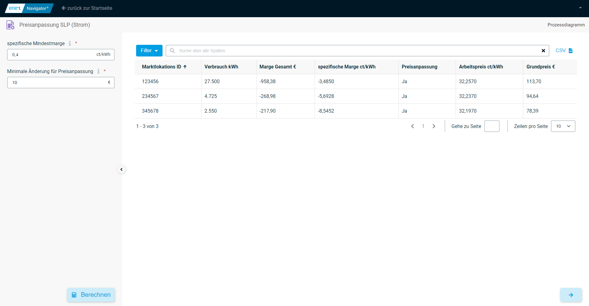 Nach der Eingabe wird angezeigt, bei welchen der importierten Lokationen eine Preisanpassung erforderlich ist und welche neuen Preise dafür kalkuliert wurden. Falls die Preise angepasst werden müssen, wird der im Laufe des Prozesses mit der App Regionalen Angebotskalkulation (Strom) neu berechnete Tarif der jeweiligen Lieferstelle zugeordnet. Nach der Berechnung wird eine Tabelle mit den folgenden Parametern ausgegeben: