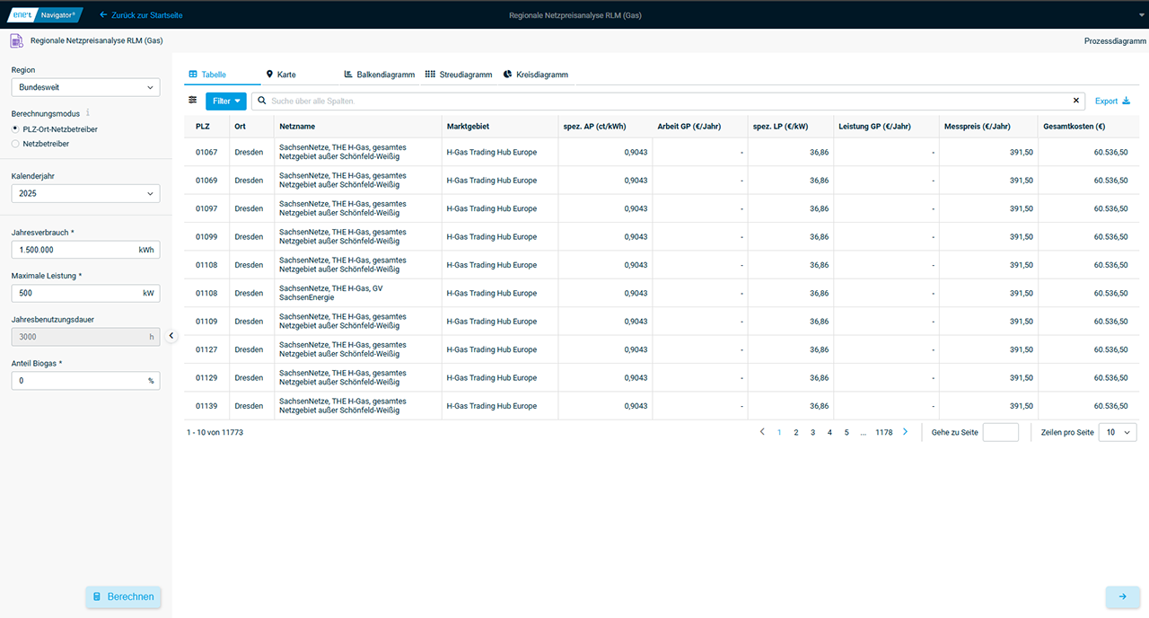 Die App Regionale Netzpreisanalyse RLM (Gas) hilft Ihnen bei der Beantwortung genau dieser Fragen. Anhand einer zuvor festgelegten Region und eines vorab bestimmten Abnahmefalls ermittelt die App die Höhe der entsprechenden Netzkosten. Sie erhalten dadurch sowohl die einzelnen Preisbestandteile als auch Informationen über die Gesamtkosten. So verschaffen Sie sich einen Überblick über die jeweilige Kostensituation und haben die Möglichkeit, Vergleiche zu ziehen.