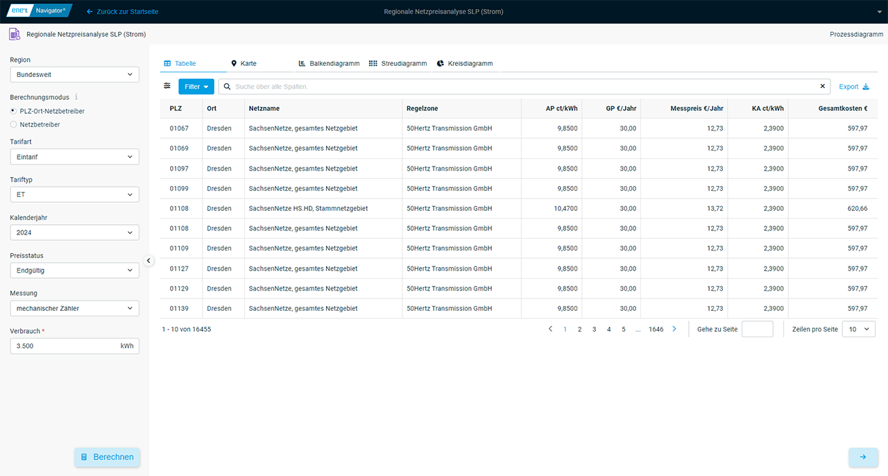 Die App Regionale Netzpreisanalyse SLP (Strom) hilft Ihnen bei der Beantwortung genau dieser Fragen. Anhand einer zuvor festgelegten Region und eines vorab bestimmten Abnahmefalls ermittelt die App die Höhe der entsprechenden Netzkosten. Sie erhalten dadurch sowohl die einzelnen Preisbestandteile als auch Informationen über die Gesamtkosten. So verschaffen Sie sich einen Überblick über die jeweilige Kostensituation und haben die Möglichkeit, Vergleiche zu ziehen.