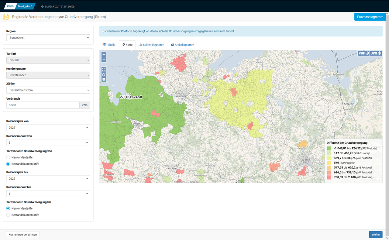 Darüber hinaus steht Ihnen eine Kartenfunktion zur Visualisierung der Preisänderungen zur Verfügung. Anhand von übersichtlichen Kreis- und Balkendiagrammen können Sie sich zudem anzeigen lassen, wie viele Postorte jeweils von den errechneten Preisdifferenzen betroffen sind.