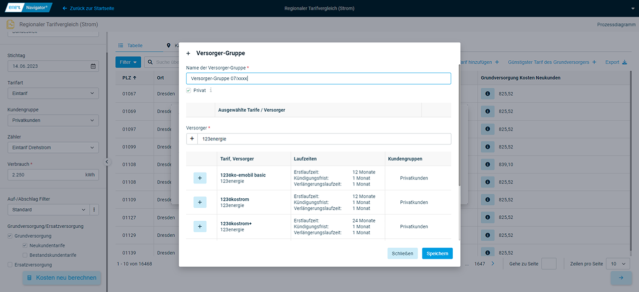 Die App Regionaler Tarifvergleich (Strom) bietet die Option, dem Vergleich weitere Produkte hinzuzufügen. Über eine Versorgersuche werden Tarife ermittelt, deren Charakteristika in Abhängigkeit der getätigten Eingaben vorgefiltert wurde. Zusätzlich kann mithilfe einer integrierten Funktion zur Definition von Tariffiltern festgelegt werden, welche Kriterien Vergleichstarife erfüllen müssen, um im Vergleich berücksichtigt zu werden.