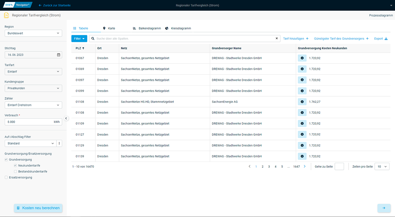 Mithilfe der App Regionaler Tarifvergleich (Strom) verschaffen Sie sich einen Überblick über die aktuellen Wettbewerbsstrukturen im Energiemarkt. Bezogen auf die Kosten regionaler Tarife finden Sie mit dem Regionalen Tarifvergleich heraus, wie konkurrenzfähig Ihr Stromprodukt im Vergleich zu den Angeboten anderer Anbieter ist. Neben dem reinen Kostenvergleich bietet Ihnen die App auch die Möglichkeit, Tarifeigenschaften zu vergleichen. Der Kostenvergleich wird Ihnen auf Knopfdruck auch als CSV-Export bereitgestellt. Da sich die zu vergleichenden Mitbewerber frei wählen lassen, haben Sie jederzeit die Möglichkeit, Ihren Vergleich flexibel anzupassen. Die App ermöglicht Ihnen einen postortscharfen Überblick über Ihre Vertriebschancen.